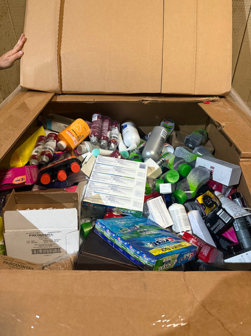 Pallets are 4 feet tall and filled with personal care items like shampoo, conditioner, and toothpaste.