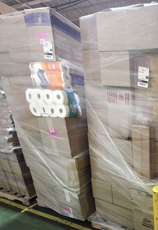 Pallets are 4 feet tall and filled with household items like paper plates, wipes, trash bags, and plastic utensils.
